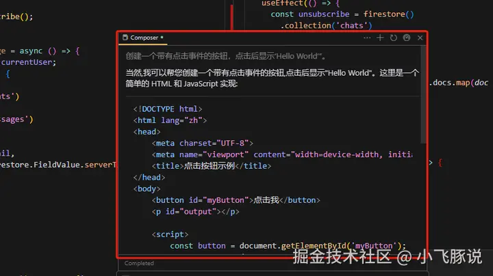 查看生成代码:Cursor AI会根据你的描述生成对应的代码片段,并在代码编辑区中显示。你可以直接使用这些代码,或根据需要进行修改。