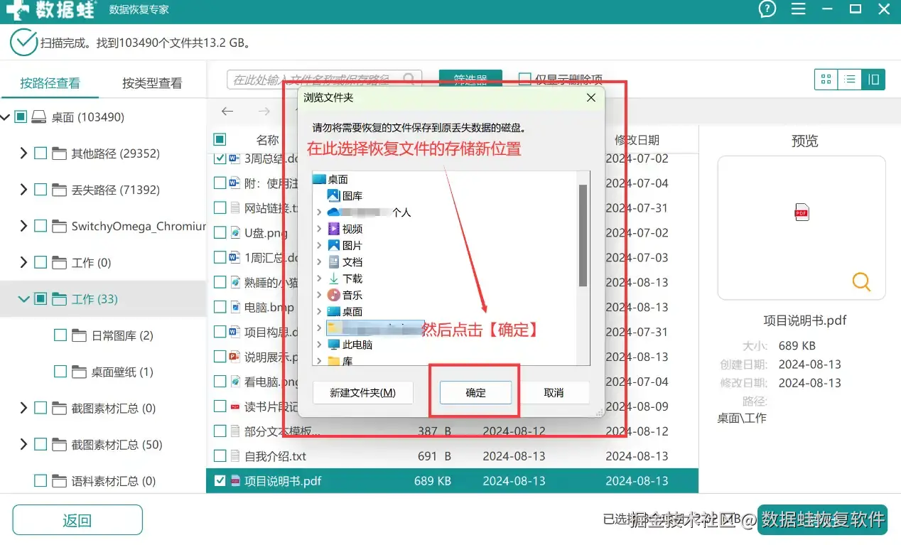 第3步: 在【浏览文件夹】里选择恢复文件的存储位置。