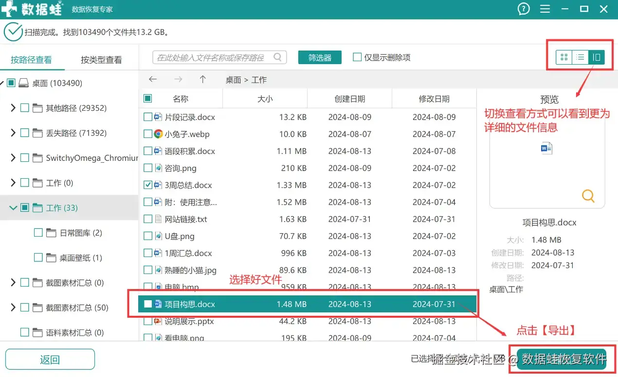 第2步: 在扫描结果的页面选择需要恢复的文件后点击【导出】,也可以选择直接点击【全部导出】,把扫描出来的文件全部恢复。