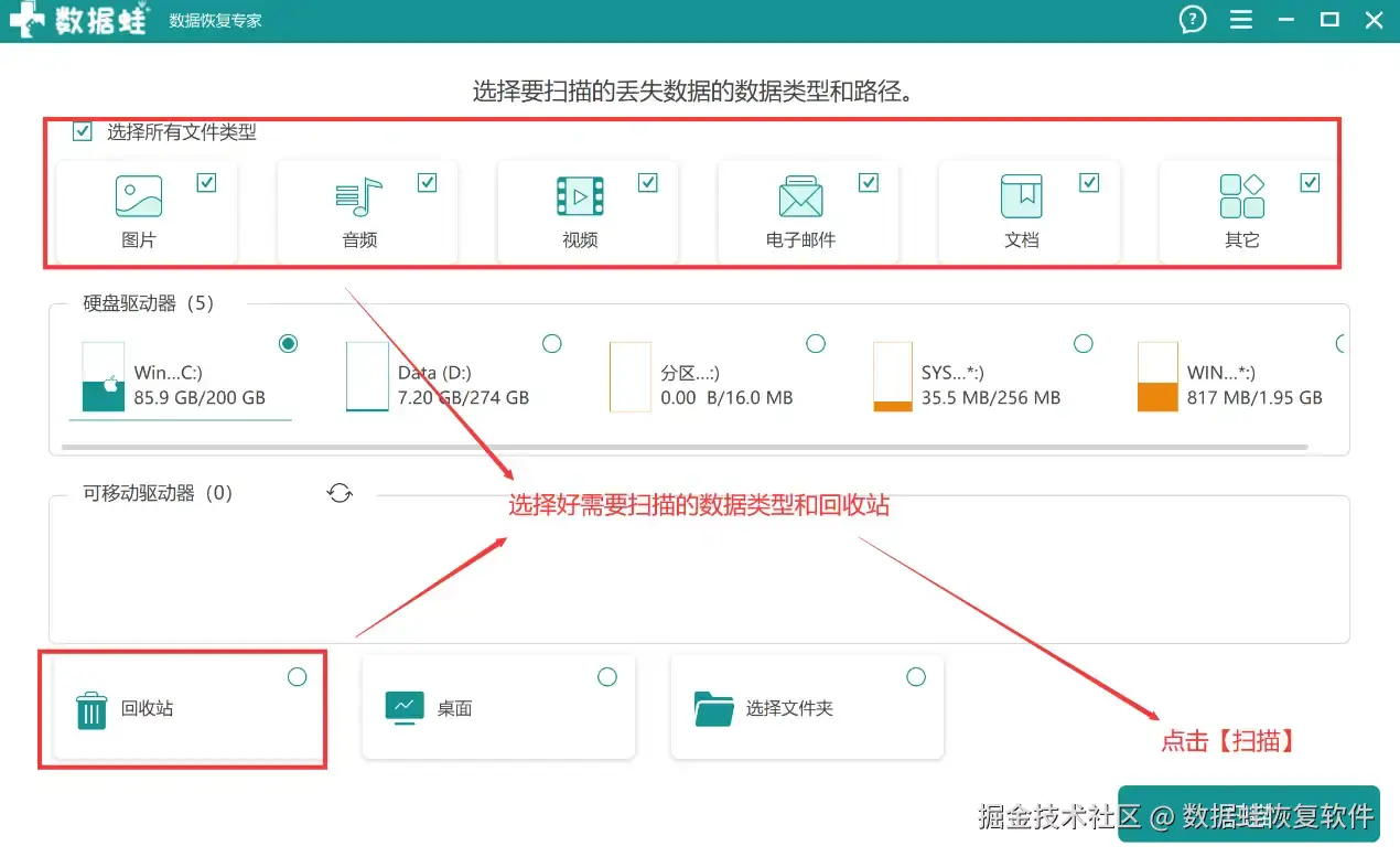 第1步: 下载安装后打开软件,在首页将需要恢复的数据类型和回收站都勾选好,然后点击【扫描】。