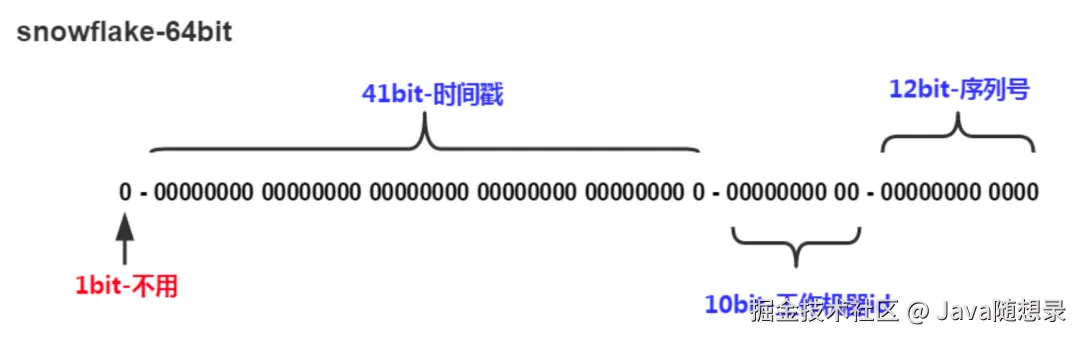 雪花算法生成的主键主要由 4 部分组成,1bit 符号位、41bit 时间戳位、10bit 工作进程位以及 12bit 序列号位。