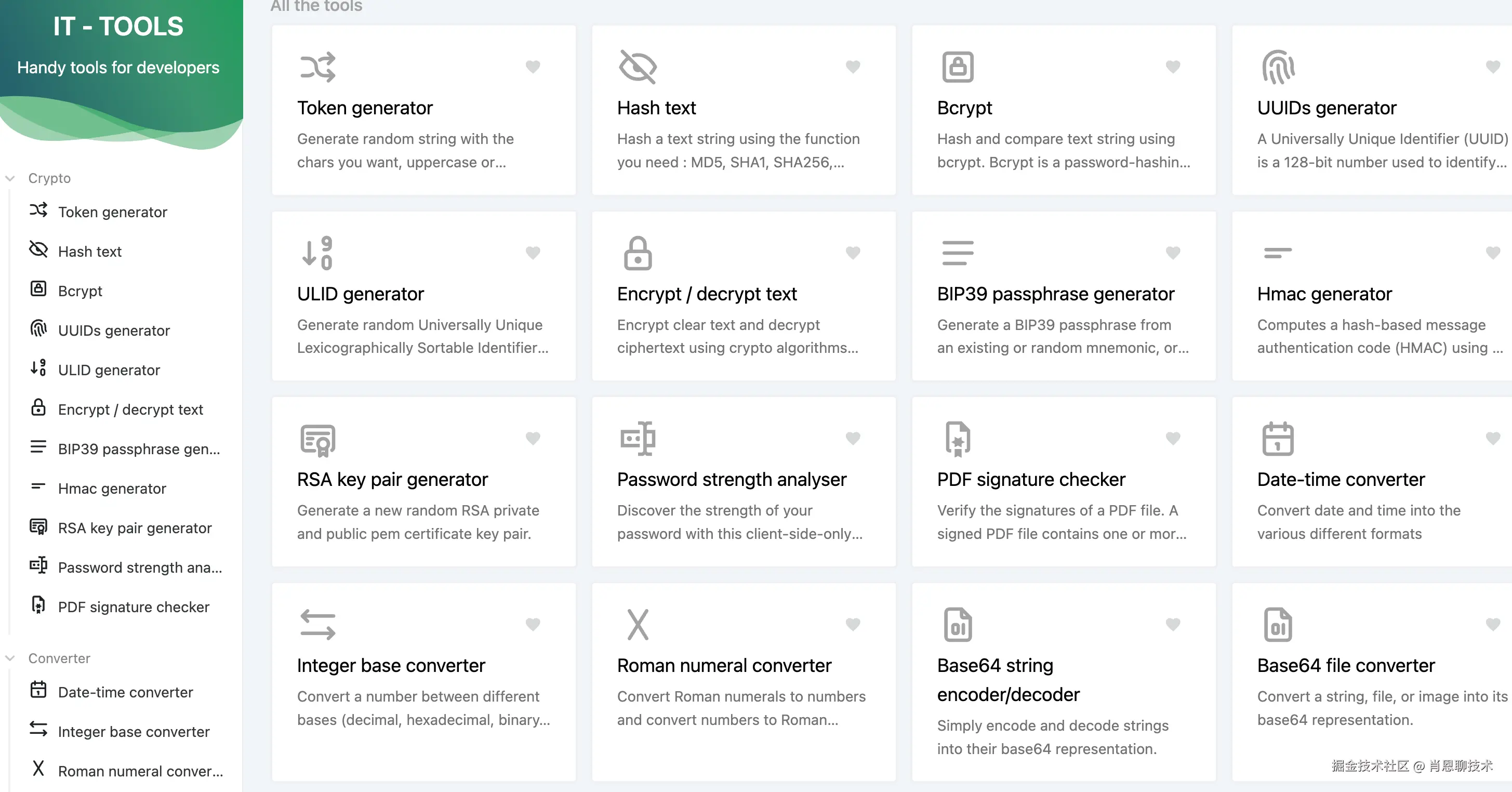 IT-Tools 是一个为开发者设计的多功能在线工具集,提供密码学、转换、编码、网络、数学、文本处理、数据解析等工具。这些工具旨在简化开发过程,提高效率,包括生成随机字符串、加密解密文本、转换数据格式、分析密码强度、验证PDF签名等。