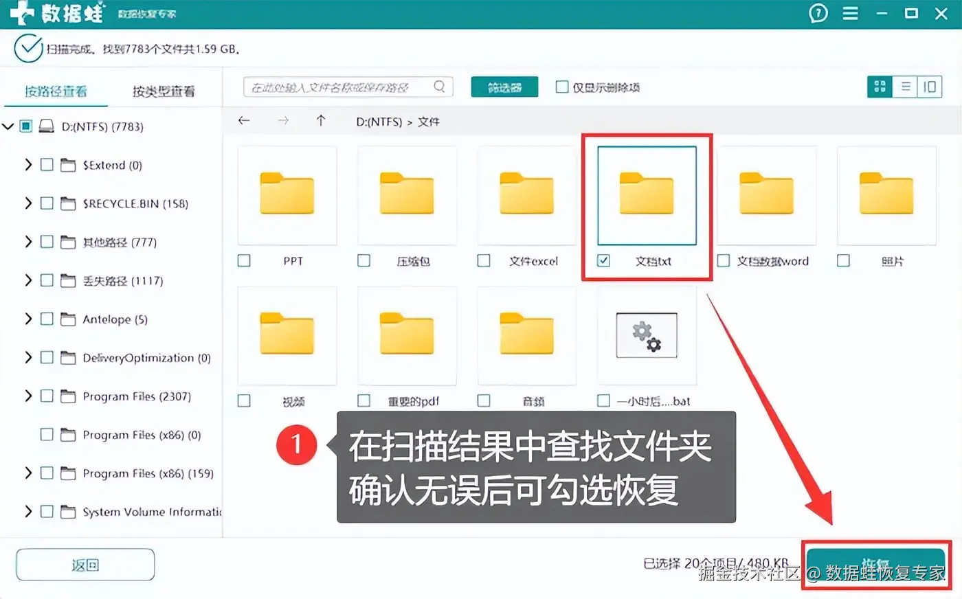 第二步:扫描完成后,指定类型和路径的数据将被呈现出来。你可以选中需要恢复的文件夹,点击 【恢复】 按钮,选择恢复路径,等待数据恢复完成。