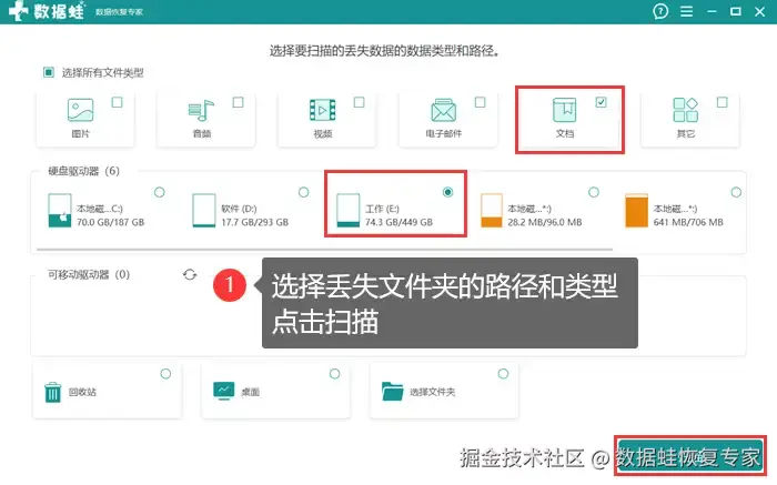 第一步:安装完成后,你可以打开运行,并在主页面中选择丢失文件的数据类型和路径,然后点击 【扫描】 ,开始深入搜索电脑数据。