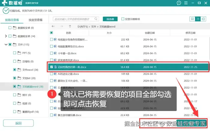 第三步:扫描完成后,软件会列出所有找到的文件。你可以通过搜索、浏览等方式,确认需要找回的项目。最后,勾选这些文件,点击 【恢复】 。