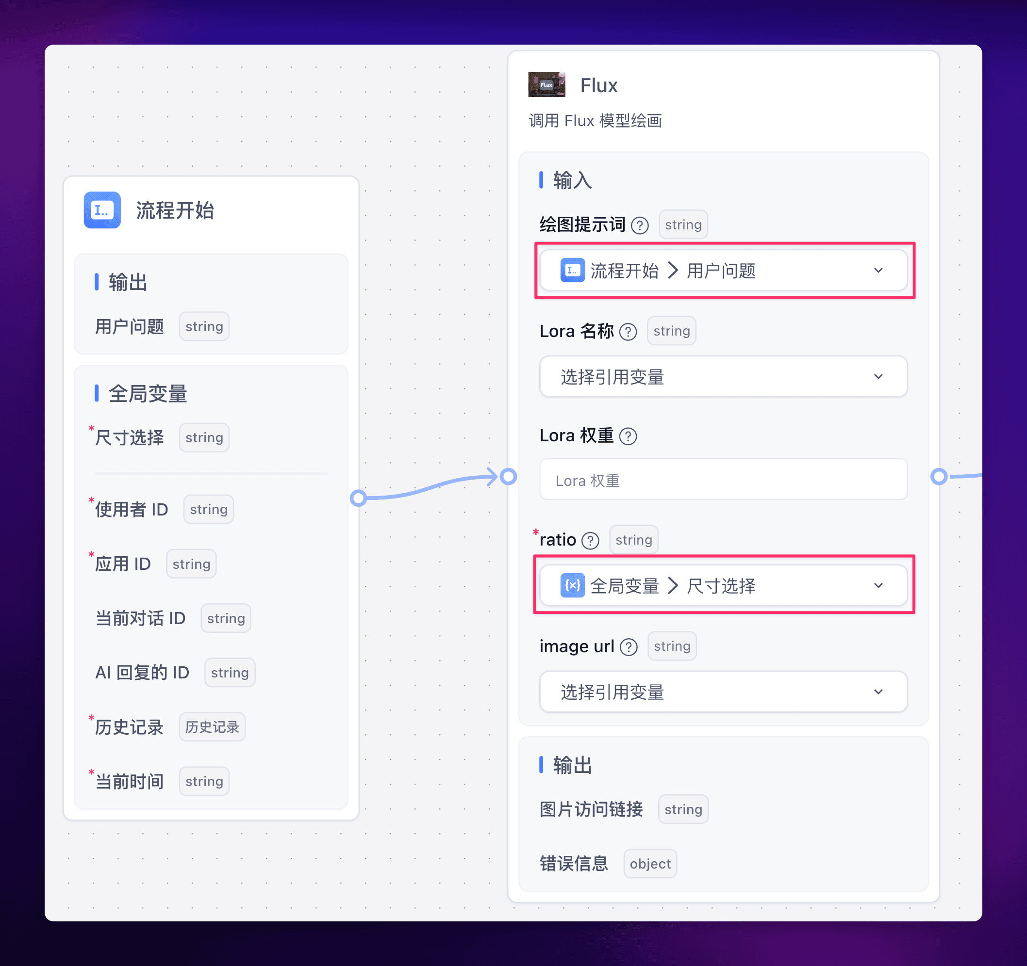 将「流程开始」和 Flux 节点连接到一起,并设置好绘图提示词和 ratio 的值。