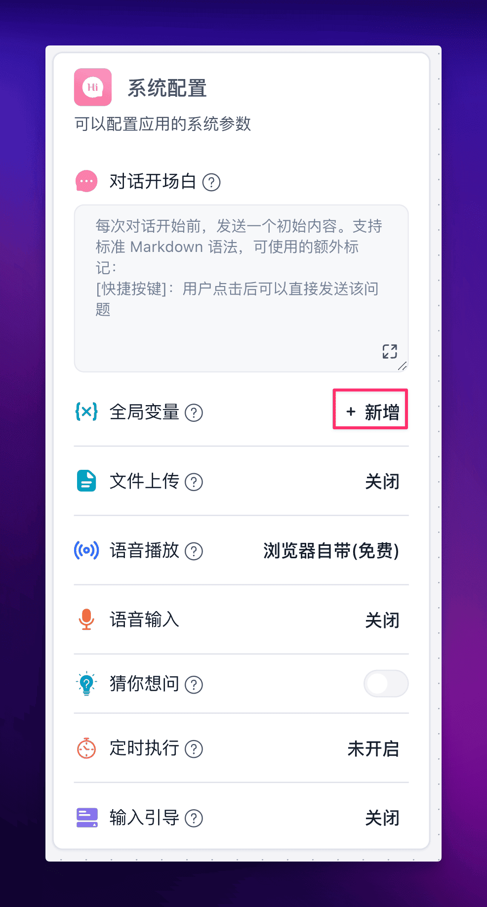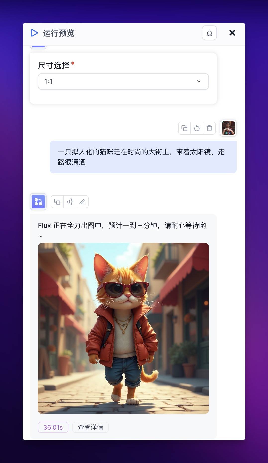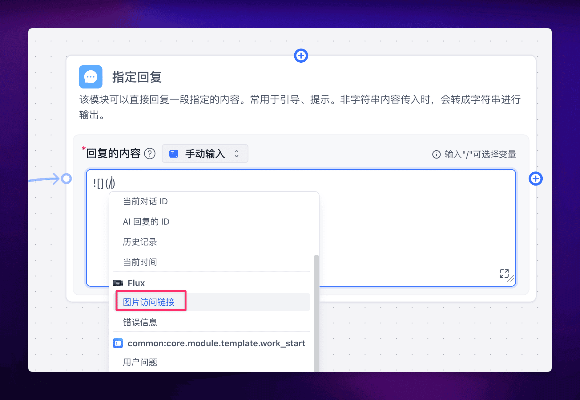 新增一个「指定回复」节点,在回复的内容中输入 ![](),然后在 () 中输入 /,在下拉框中选择 Flux 的图片访问链接。