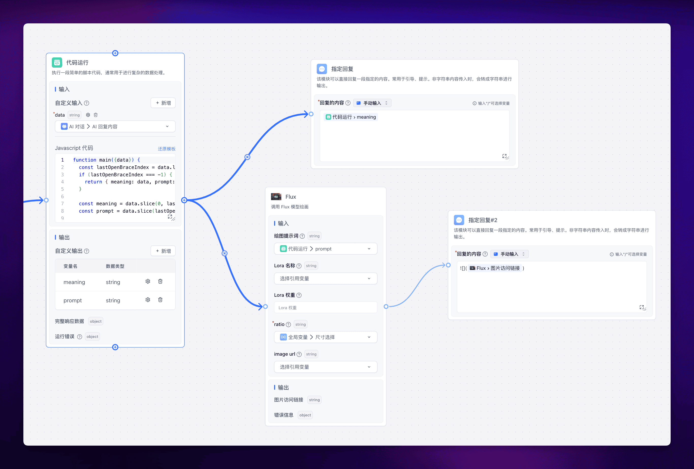 接下来是代码运行节点,主要功能是将 AI 回复内容进行拆分,{ [图像 prompt] } 之前的内容单独回复,{ [图像 prompt] } 中的内容发送给 Flux 绘画节点。