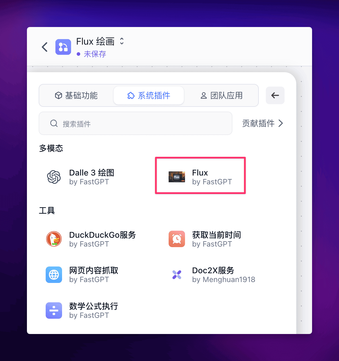 点击左上角的 +,然后依次选择「系统插件」--> 「Flux」:
