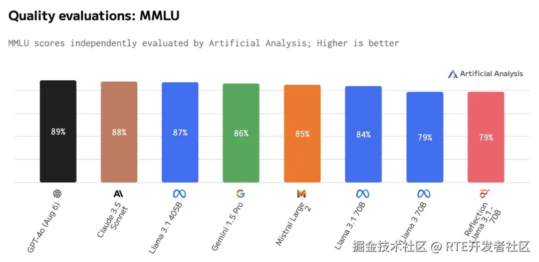 Reflection 70B 由两位开发者(HyperWrite CEO Matt Shumer 和 Glaive AI 创始人 Sahil Chaudhary)仅用 3 周开发完成。然而,Artificial Analysis 的独立评估表明,该模型的 MMLU 得分仅与 Llama 3 70B 相同,并低于 Llama 3.1 70B。此外,科学推理与知识(GPQA)和定量推理(MATH)测试结果也未达到预期。