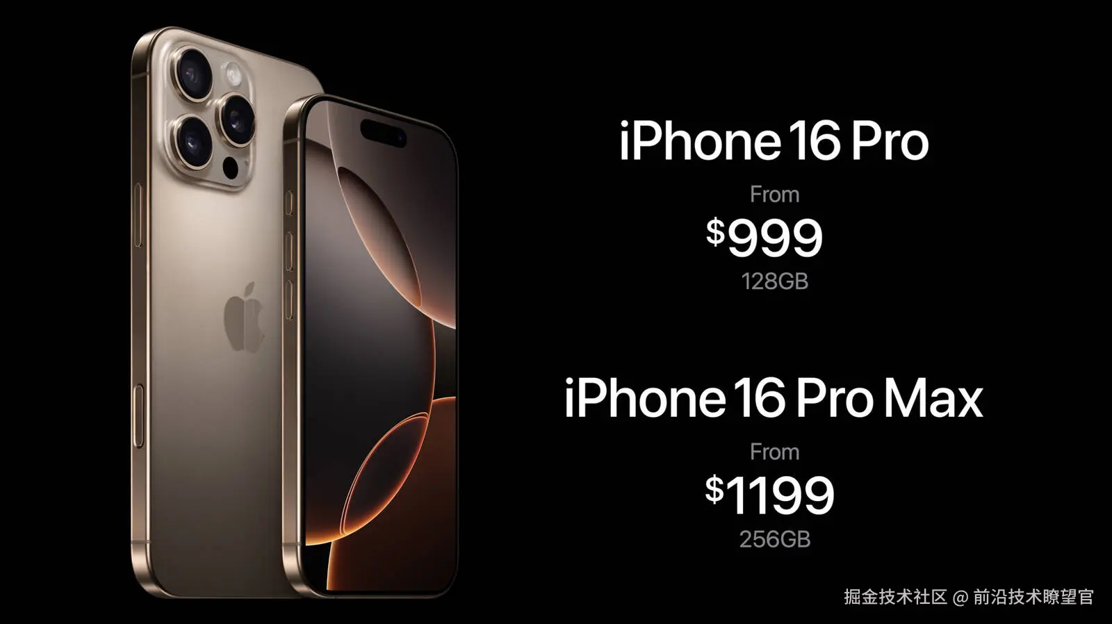 iPhone 16 Pro 128GB 起售价为 999 美元,iPhone 16 Pro Max 256GB 起售价为 1199 美元,将于周五开始接受预订,并于 9 月 20 日上市。