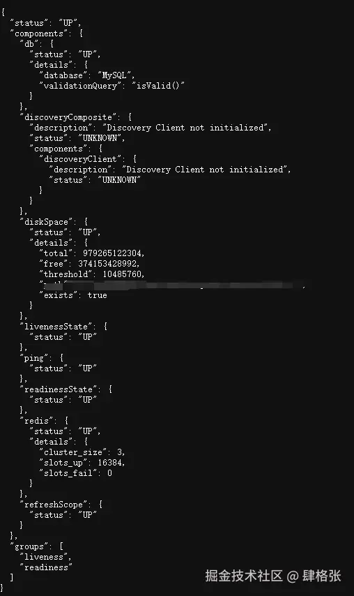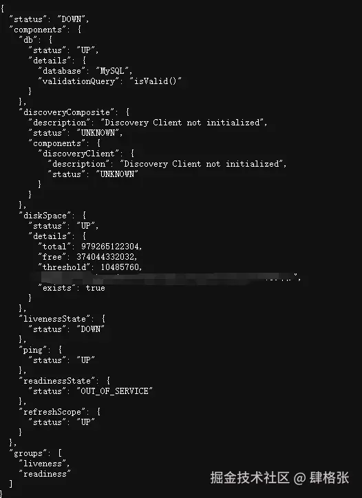 如上如,我们访问IP + PORT + /acacutor/health看到的是所有组件的健康状态,也可以通过配置禁用某个组件的健康监测