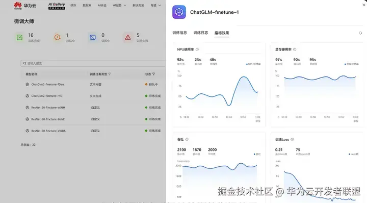 模型微调训练完成后即可生成开发者的专属大模型,开发者可以查看相关的训练指标效果,比如资源使用率,训练 Loss 曲线等。