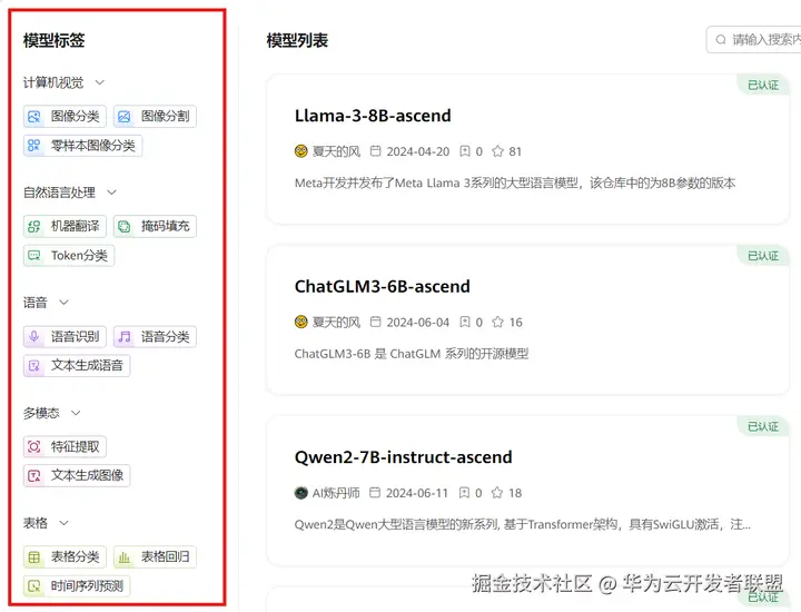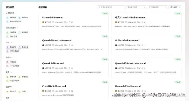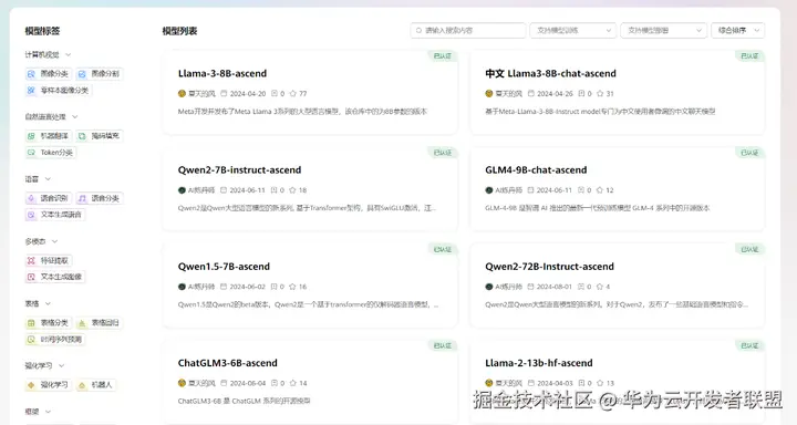 常规的对话大模型之外,AI Gallery 还提供计算机视觉、深度学习方面的模型,开发者可以根据左边的标签分类,选择自己需要的。