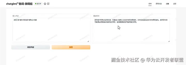 在模型详情页选择 “部署> AI 应用” 进入页面,开始 AI 应用创建设置,如名称、规格等等,完成基本信息设置后,即可进入到可视化页面。直接输入你的需求,比如为产品收腰的鱼尾裙写一段广告词,启动推理,便可在右侧获得模型推理的结果。