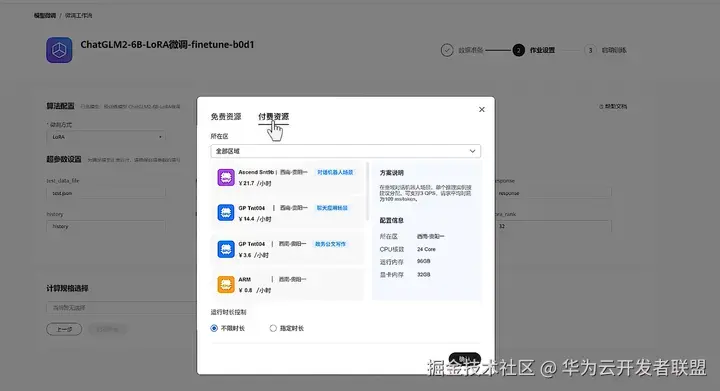 然后选择适合该大模型训练的计算规格,当前通过大量开发者实践,针对主流昇腾云开源大模型,AI Gallery 沉淀了最佳的算力组合方案。开发者可以直接选择推荐的规格,确认配置信息,并正式启动训练任务。