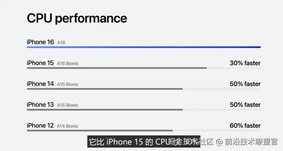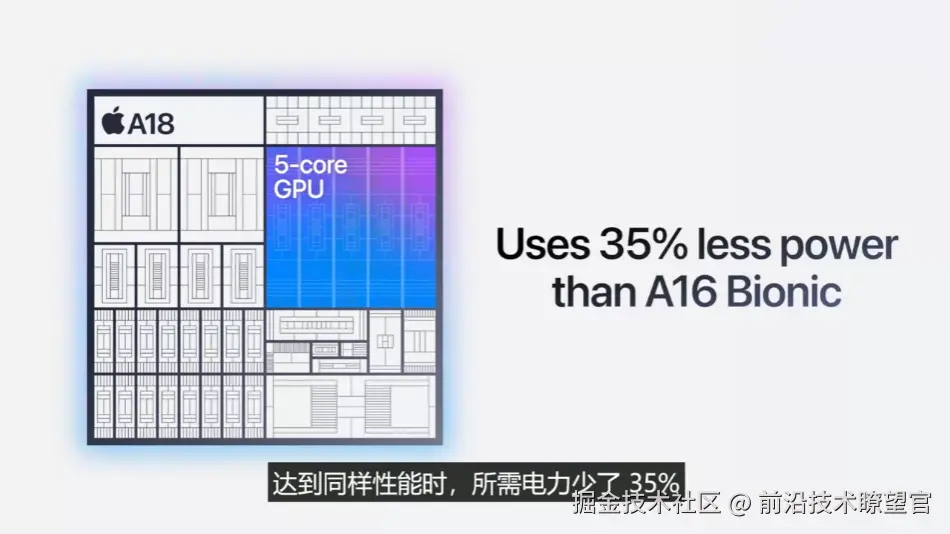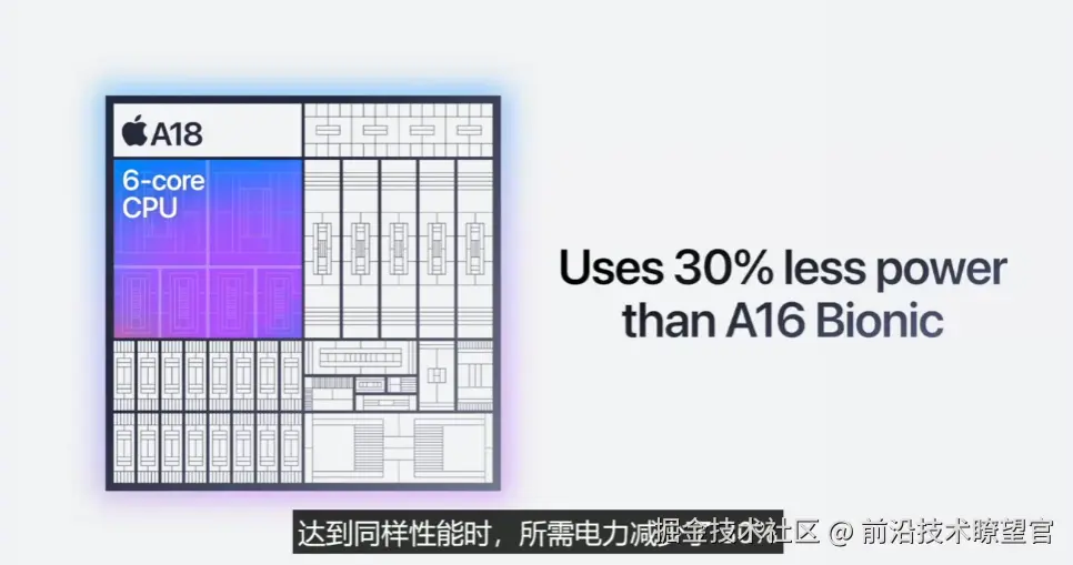 苹果 A18 芯片发布:iPhone 16 系列首发,CPU 提升 30%、GPU 提升 40% 前沿技术瞭望官 2024-09-10 292 阅读1分钟 苹果今日正式发布了 A18 芯片,新的芯片采用 3nm 工艺打造,将在 iPhone 16 Pro 系列中首发搭载。 CPU 方面,A18 芯片的 6 核 CPU 比 iPhone 15的 A16 Bionic 快 30%,能耗降低 30%。 GPU 方面,A18 芯片的 5 核 GPU 性能比iPhone 15 的 A16 Bionic 快 40%,能耗降低 35%。 该芯片还将搭载神经网络引擎,IT之家将跟进 A18 芯片的后续细节信息。
