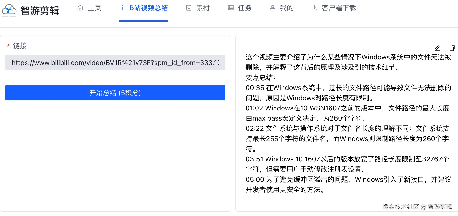 教你一键总结B站视频 智游剪辑 2024-09-10 451 阅读1分钟 B站作为一个学习网站,上面有很多学习视频,虽然视频很多,但是我们每天的时间是有限的,这个时候我们就需要一个工具进行总结,让我们不需要完整看完视频即可快速获取需要的信息,下面给大家介绍一下如何快速对B站视频的主要内容进行总结 使用说明 打开智游剪辑(zyjj.cc),搜索B站视频总结 我们复制一下B站的视频链接,然后点击总结就可以了 效果预览
