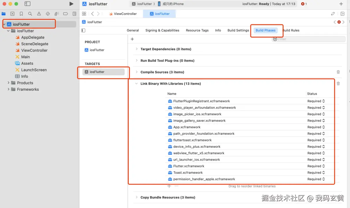 在 Xcode 中,选择你的 target ,然后在 Build Phases 下的 Link Binary With Libraries 部分,添加你刚刚打包好的 Flutter framework 文件。