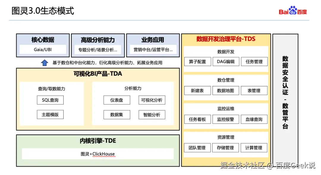 百度MEG的上一代大数据产品存在平台分散、质量不均和易用性差等问题,导致开发效率低下、学习成本高,业务需求响应迟缓。为了解决这些问题,百度MEG内部开发了图灵3.0生态系统。图灵3.0覆盖了数据全生命周期,包括Turing Data Engine (TDE) 计算引擎、Turing Data Studio (TDS) 数据开发治理平台和Turing Data Analysis (TDA) 可视化BI产品。