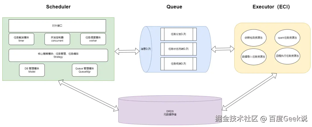 整体上,分为了Scheduler调度器和Executor执行器两个模块,中间通过消息队列进行任务的分发和任务状态的流转,使用DRDS进行任务和调度实例的元数据存储。