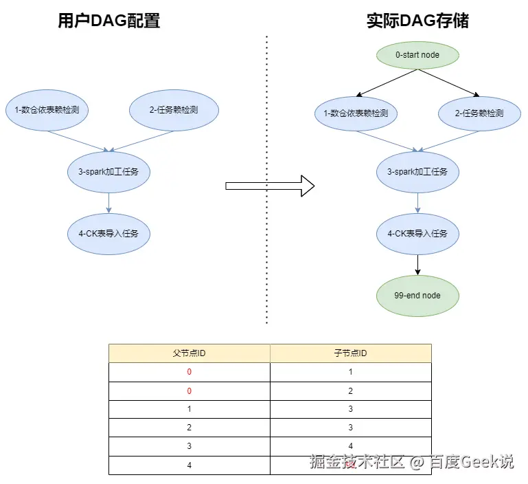 在用户配置的DAG关系的基础上,添加了一个虚拟的开始节点和一个虚拟的结束节点,确保我们每个任务的DAG图有唯一的入口和出口。