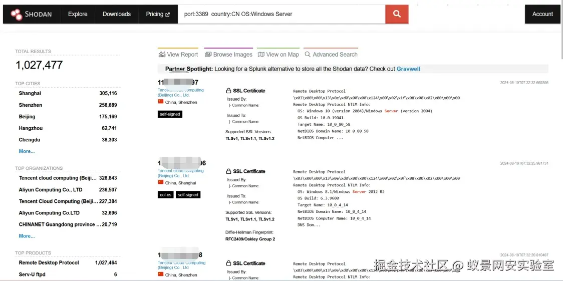 探测辖区内或者某一地区的资产当然离不开空间测绘工具,fofa、鹰图、shaodan、zoomeye等著名的自然要尝试一遍,搜索的关键词首先是国内+3389和135端口+windows server操作系统,协议的话可以组合RDP/RDL,这样一来搜出的资产会多达几百万条,百万量级的数据处理起来对于我们这种小散户而言属于天方夜谭。况且这些空间测绘平台中有的甚至不支持非会员大数据量查询,像shaodan这样能够显示出来已经是仁慈的了: