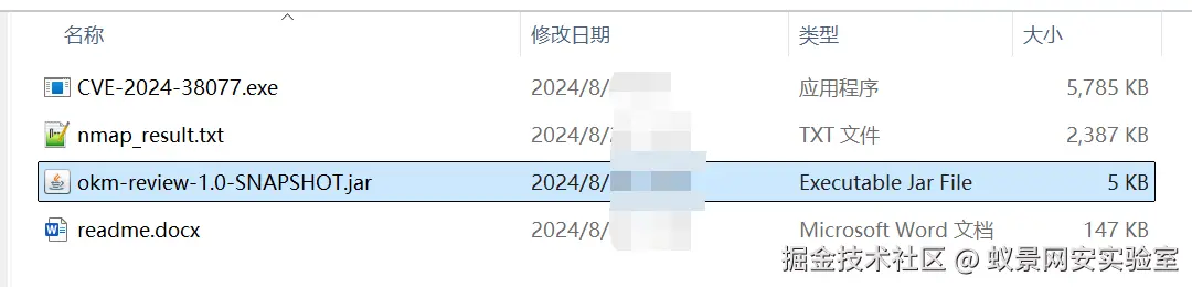 这里贴出的只是关键的两段代码,完整项目见文末链接。最后将项目打成jar包,与CVE-2024-38077.exe和Nmap输出文件放在同一目录下: