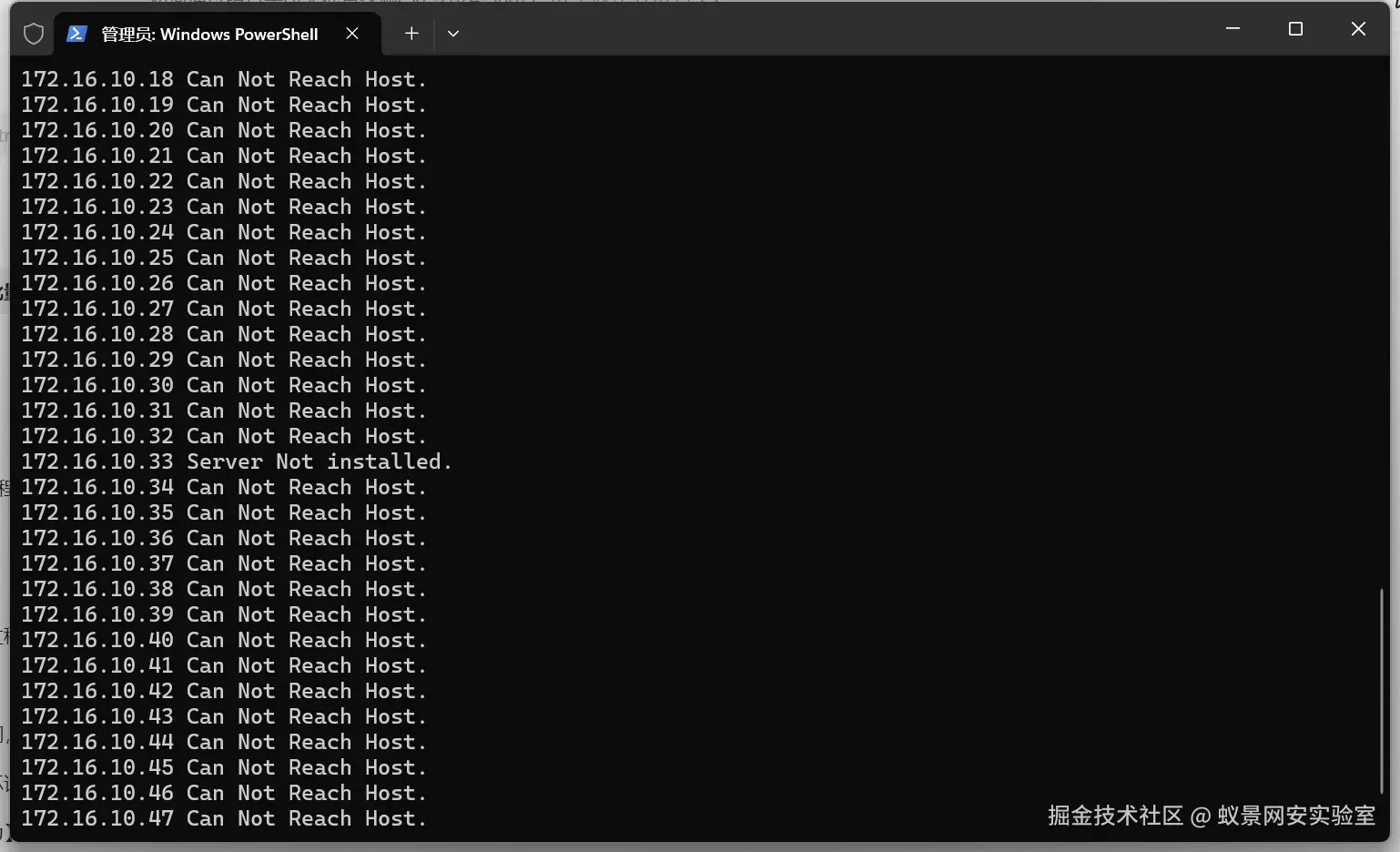 //循环执行exe工具,参数是nmap的IP,并逐个获取执行结果for (int i = 0; i < list.size();i++) { MNmap nmap1 = list.get(i); if ("open".equals(nmap1.p135) && "open".equals(nmap1.p3389)) { try { // 指定要执行的exe文件及其参数 ProcessBuilder processBuilder = new ProcessBuilder(exeFile, nmap1.ip); // 启动进程 Process process = processBuilder.start(); // 读取标准输出 BufferedReader r = new BufferedReader(new InputStreamReader(process.getInputStream())); String l; while ((l = r.readLine()) != null) { if (l.contains("Vulnerability")) System.out.println(l); } // 读取标准错误(如果需要) BufferedReader errorReader = new BufferedReader(new InputStreamReader(process.getErrorStream())); String errorLine; while ((errorLine = errorReader.readLine()) != null) { System.out.println("Standard Error: " + errorLine); } // 等待外部程序执行完成 int exitCode = process.waitFor(); if (exitCode == 0) { System.out.println("程序执行完成"); } else { System.out.println("程序执行出错,退出码:" + exitCode); } } catch (IOException | InterruptedException e) { e.printStackTrace(); } //计数 count++; }}System.out.println("total: " + count);