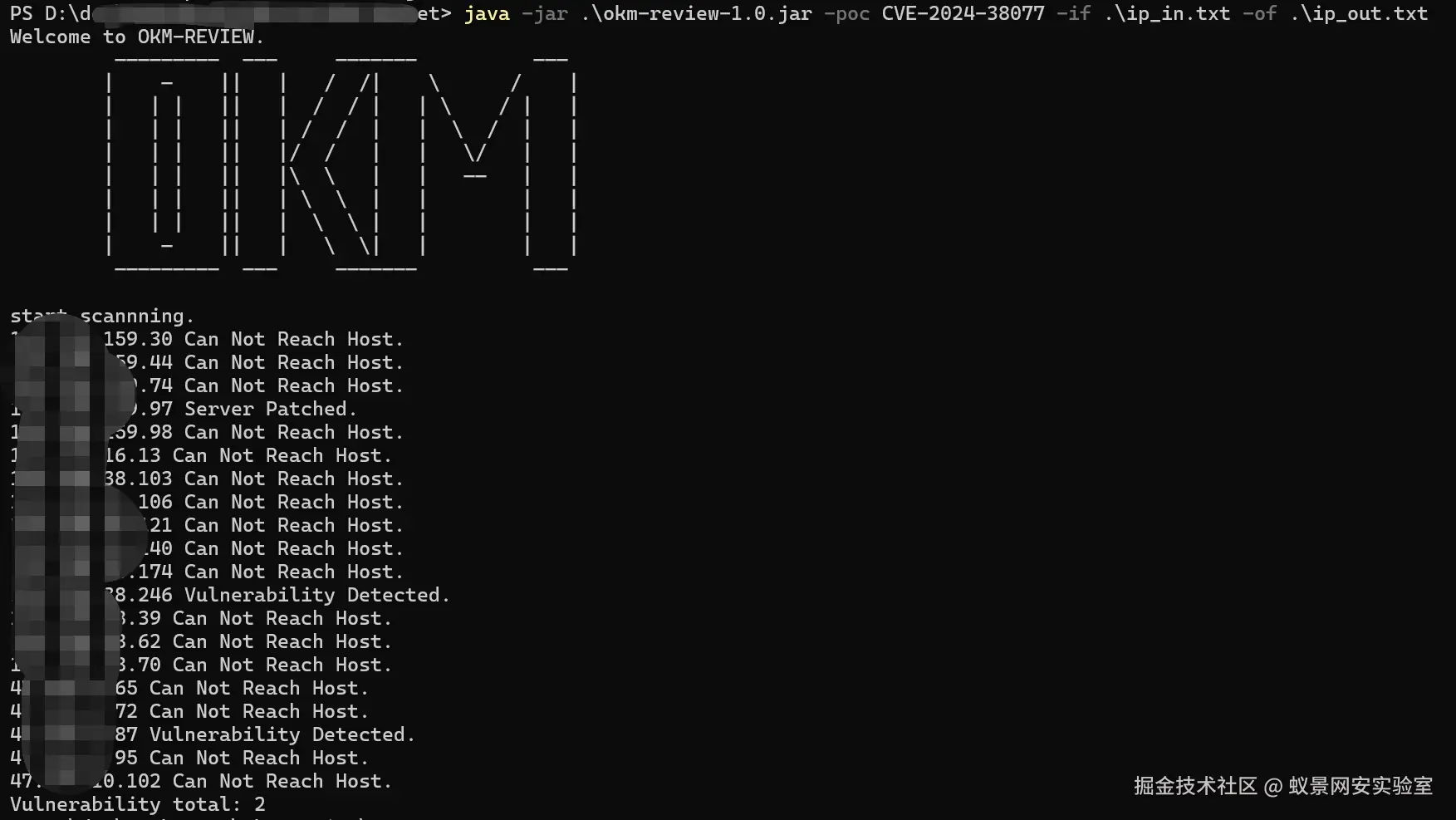 开启powershell运行jar包,设置poc参数为CVE-2024-38077,同时指定输入IP的文件路径和输出文件路径,等待扫描完后得到存在漏洞的资产列表。