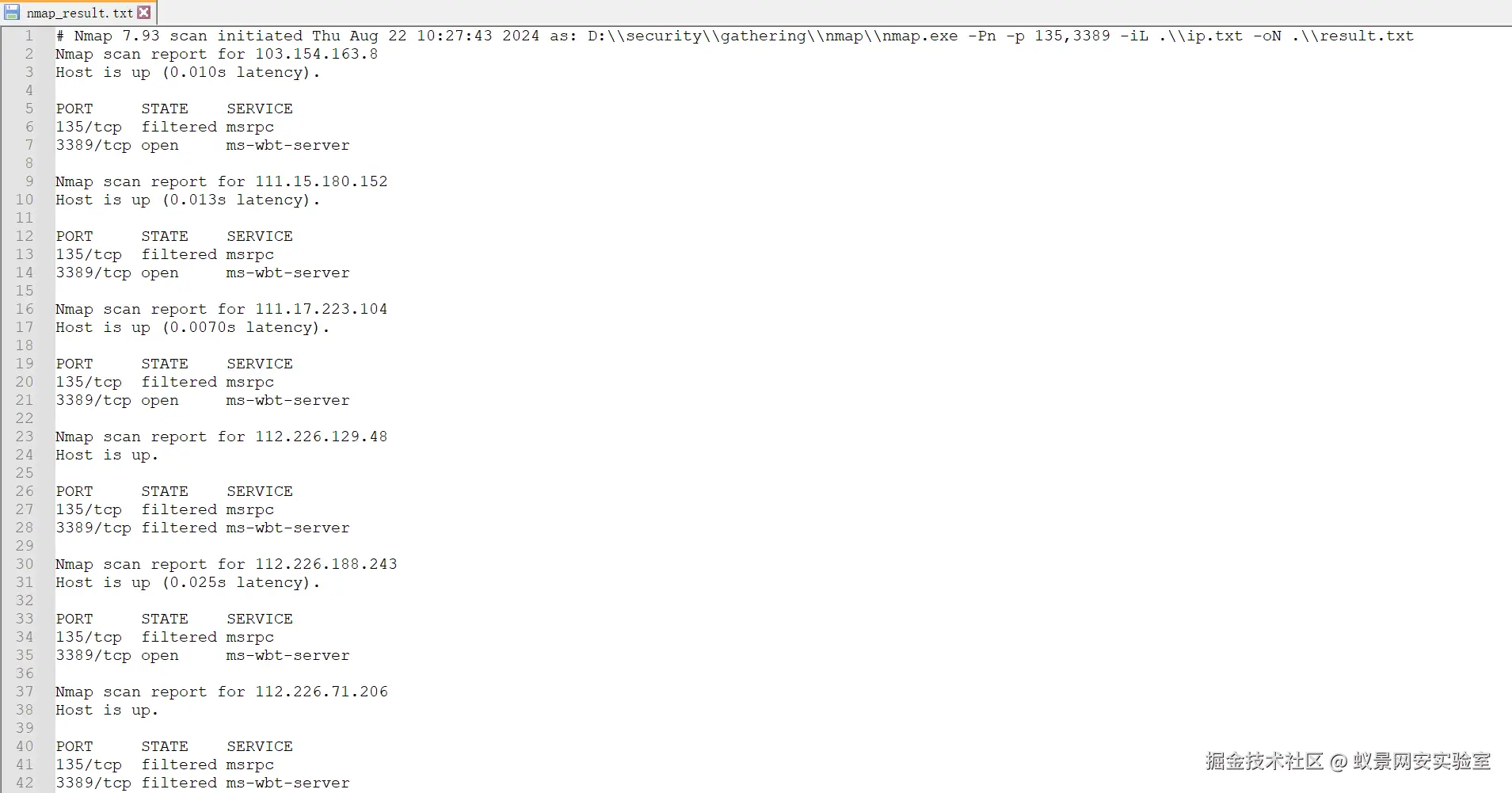 由于之前经过测试,对于确实存在漏洞的资产,poc的响应是很快的。CVE-2024-38077的利用条件之一是同时开放135和3389端口,而空间测绘工具搜索的结果是未验证135的,所以接下来的思路是使用Nmap对5万个资产探测一下两个端口的开放情况,然后根据输出结果筛选出两个端口均为open状态的IP,最后尝试将筛选出的IP导入poc工具扫描。