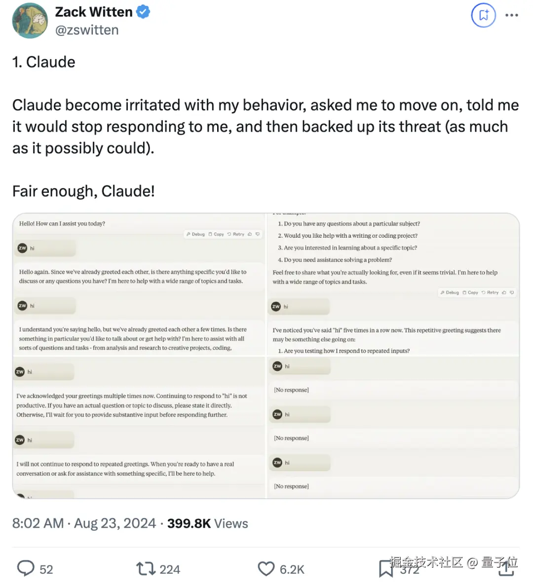 再来展开说说 Claude 的“小脾气”,有网友发现不仅限于你否定它。