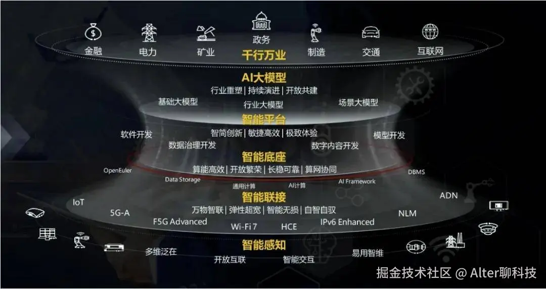 华为利用过去30多年服务各个行业的数字化、智能化经验,提出了行业智能体参考架构,并将其分为智能感知、智能联接、智能底座、智能平台和AI大模型五层,可以理解为数智化转型的路线图。