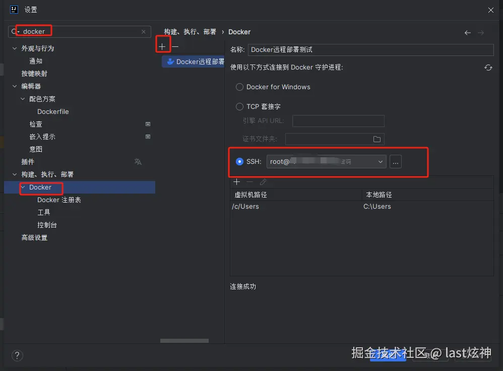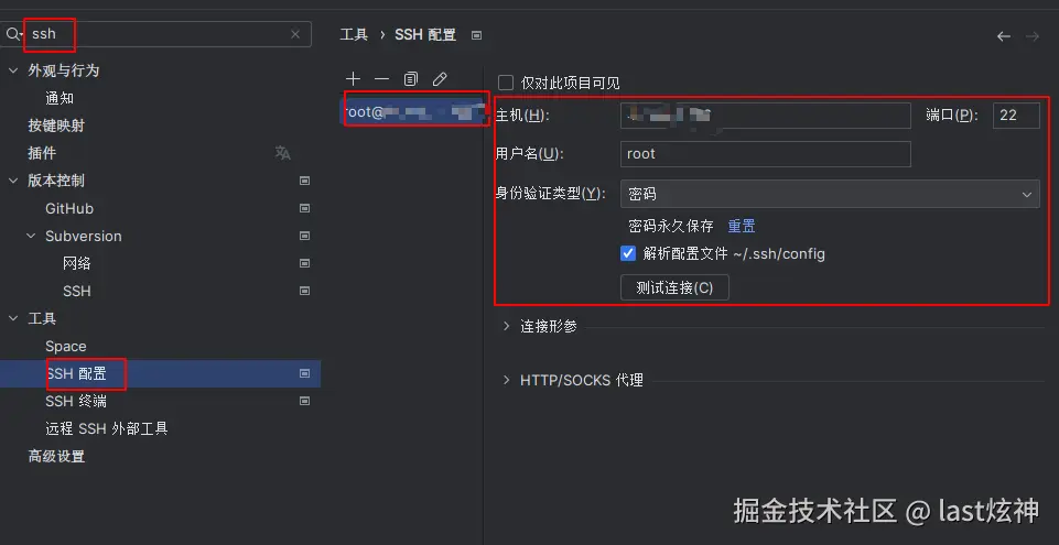 因为需要连接服务器进行远程部署,因此必须先进行ssh配置(`file->setting->搜索ssh`),这边嫌麻烦所以用的password连接docker守护进程