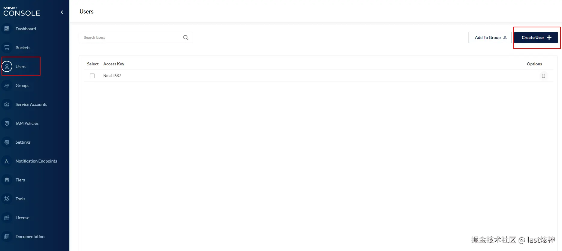 1. **创建一个Bucket存储桶用于文件上传操作**- 点击User创建用户
