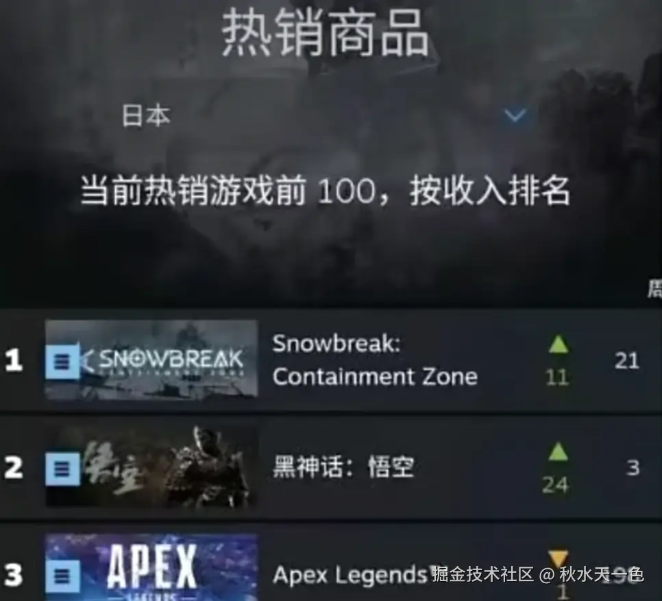 而与【棕色尘埃2】境遇相似的还有西山居的【尘白禁区】,最初上架谷歌商店时【尘白禁区】分级为12+,随着游戏运营策略改变、角色衣着越来越暴露之后,【尘白禁区】海外服【Snowbreak: Containment Zone】因尺度问题被谷歌商店官方拒绝上架8月版本更新。而在8月22日卡池更新后,不少无法正常更新游戏的心碎日本老哥冲向Steam愤怒氪金,直接把【尘白禁区】送上了销量榜榜首,还压了【黑神话:悟空】一头,堪称业界奇观。