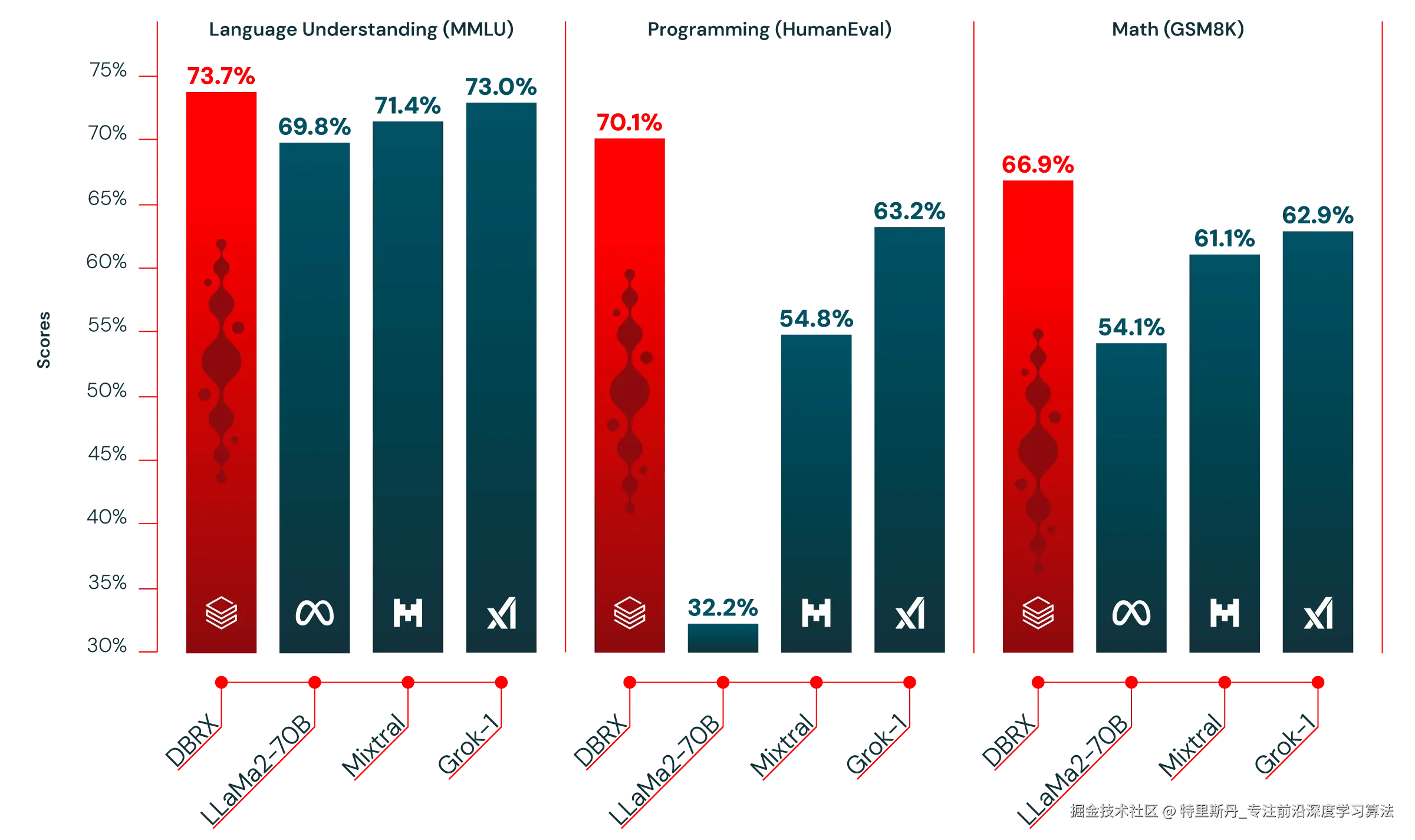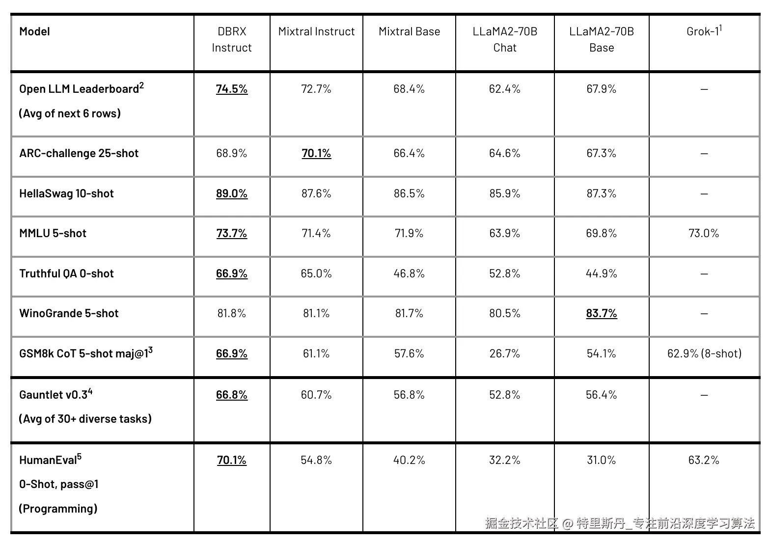 - the Databricks Gauntlet (66.8% vs. 60.7% for the next highest model, Mixtral Instruct).