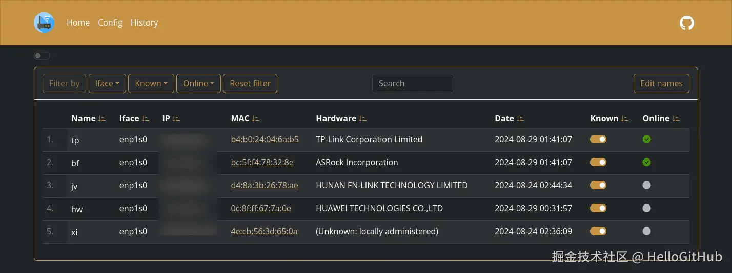 这是一个自带 Web 界面的 IP 扫描工具,可作为轻量级的监控平台。它可以扫描本地/公共网络中的 IP 和端口,帮助用户实时监控主机的在线和离线状态,并记录历史数据。当检测到新设备时,它还能发出通知,让运维人员快速了解当前网络中的变化,从而更方便地维护和追踪网络设备状态。