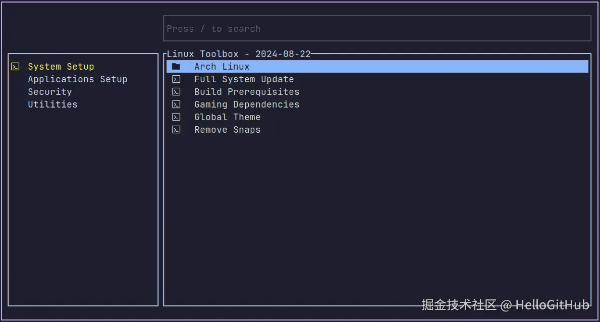 该项目是专为 Linux 设计的命令行工具,旨在简化日常 Linux 任务。它使用 Rust 语言开发命令行界面,提供了一系列常用的自动化脚本和命令,兼容多个 Linux 发行版,功能包括软件安装、系统优化和安全配置(防火墙)等方面。