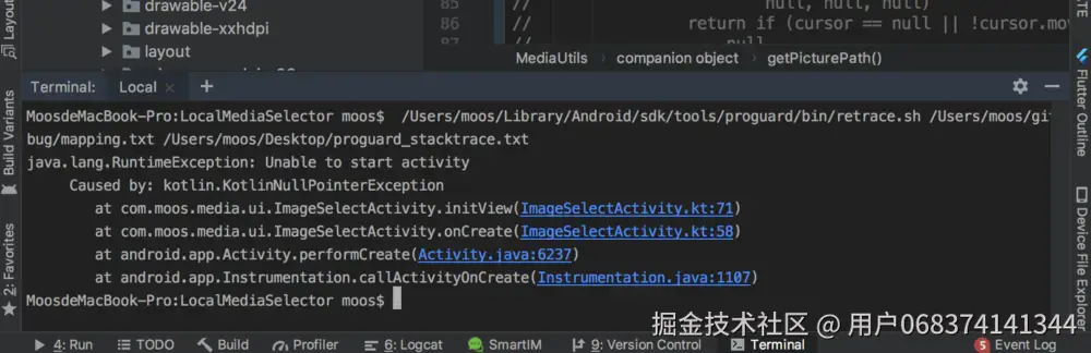 选择 ReTrace 栏 ,并添加我们项目中混淆生成的 mapping.txt 文件所在位置,然后将我们的混淆后的崩溃信息复制到 Obfuscated stack trace 那一栏,点击 ReTrace! 按钮即可还原出我们的崩溃日志信息,结果如上图所示,我们之前的混淆日志:at com.moos.media.ui.ImageSelectActivity.k(ImageSelectActivity.kt:71) 被还原成了 at com.moos.media.ui.ImageSelectActivity.initView(ImageSelectActivity.kt:71)。ImageSelectActivity.k 是我们混淆后的方法名,ImageSelectActivity.initView 则是最初未混淆前的方法名,借助于 ReTrace 工具的帮助,我们就可以像以前一样很快定位到崩溃代码区域了。