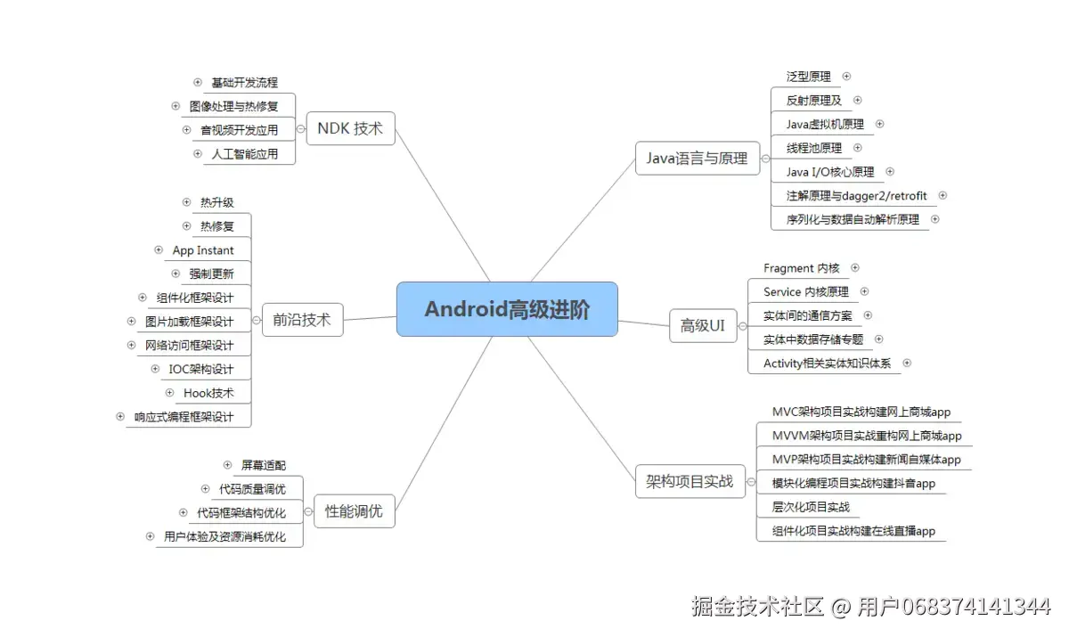 我搜集整理过这几年阿里,以及腾讯,字节跳动,华为,小米等公司的面试题,把面试的要求和技术点梳理成一份大而全的“ Android架构师”面试 Xmind(实际上比预期多花了不少精力),包含知识脉络 + 分支细节。