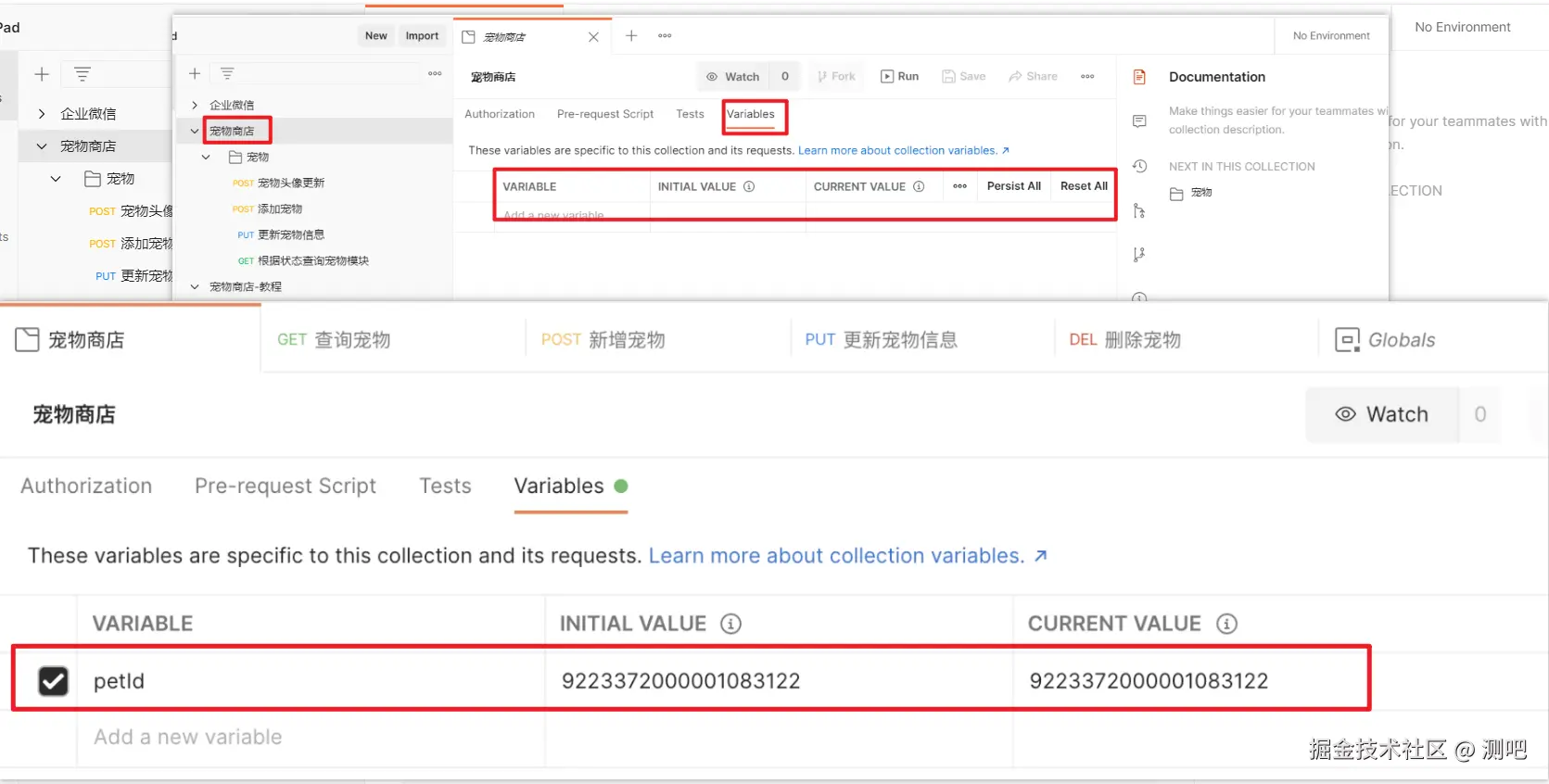前面的宠物操作都涉及到了宠物 id 的值,可以把宠物 id 设置为测试集变量。