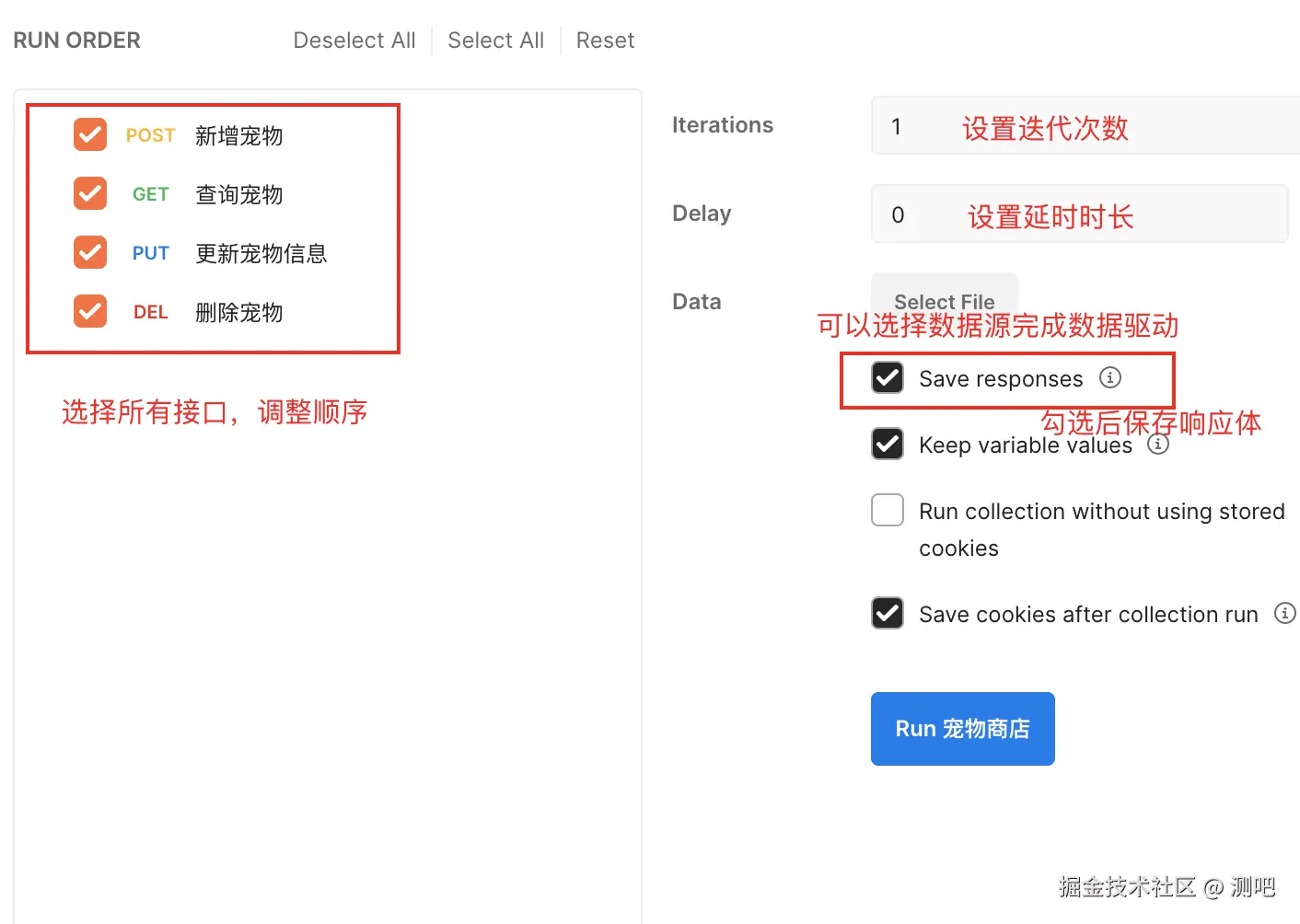 collection,选择环境变量、选择执行次数、选择延迟时间,选择测试数据(做数据驱动) - 点击