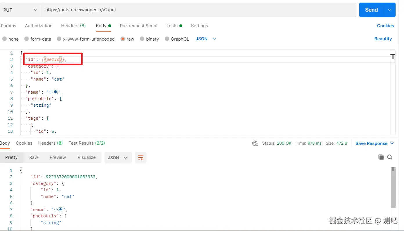 pm.response.to.have.body("{"id":" + petId + ","category":{"id":1,"name":"cat"},"name":"小黑","photoUrls":["string"],"tags":[{"id":5,"name":"cute"}],"status":"available"}");