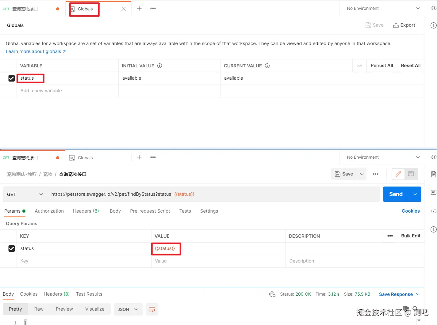 这样设置就相当于在请求之前,先把全局变量 status 的值设置为了 sold,所以请求的结果也是返回的 sold 状态的宠物信息。