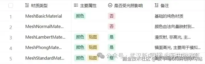 对于基础材质MeshBasicMaterial我们主要使用的属性
