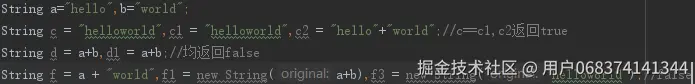 c,c1,c2的地址值相同,都在常量池中,所以返回true。d相当于d=new String(a+b),是在堆内存中,地址不同所以返回false。