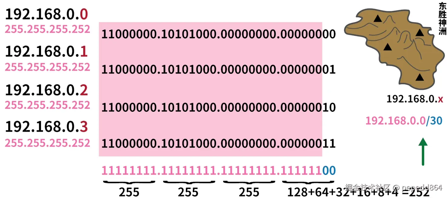 255.255.255.252或者是CIDR的方式表示,如192.168.0.0/30表示掩盖IP的二进制前30位数