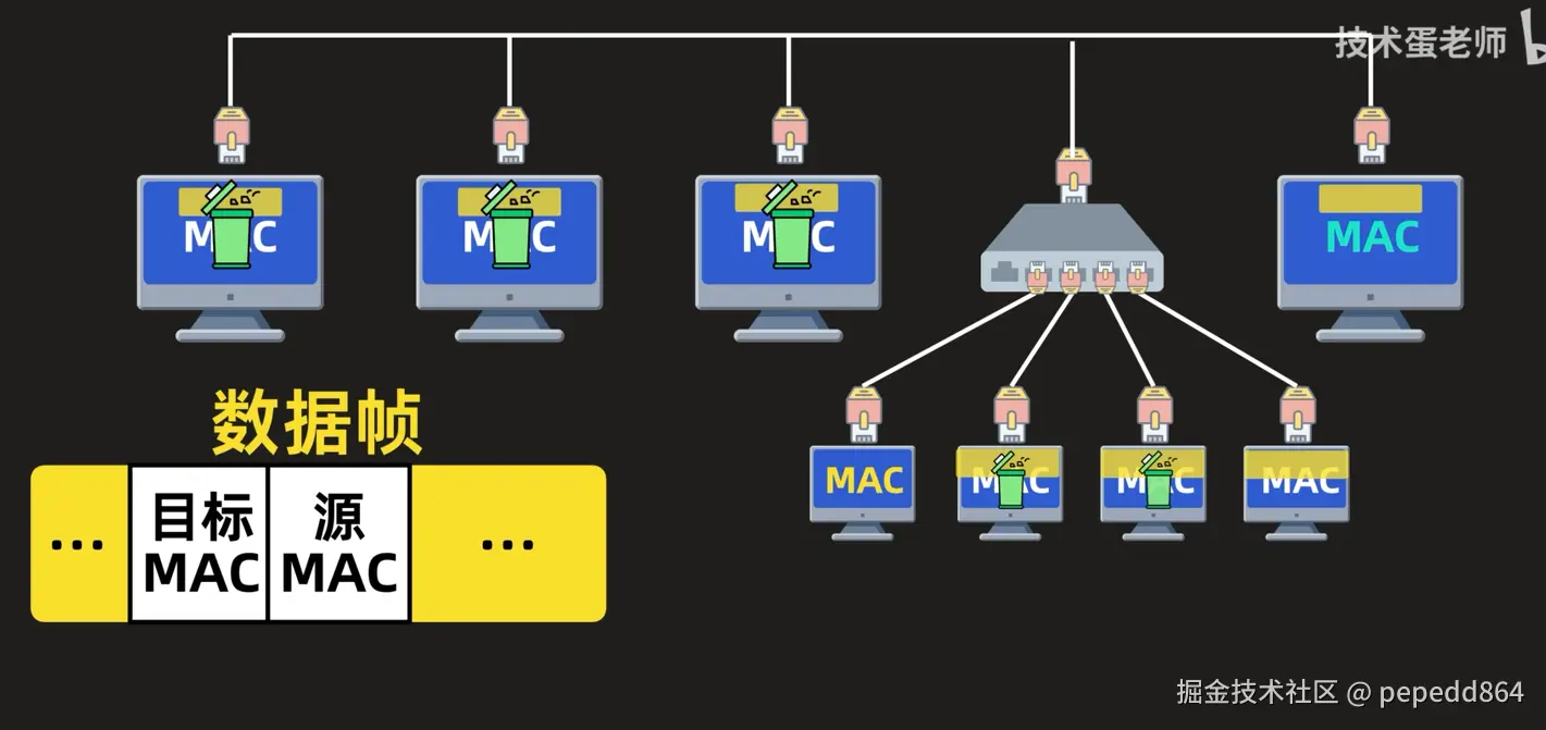 要发送数据之前,讲数据封装成数据帧,包含目标MAC和源MAC,通过网线传输所有设备都可以接受到数据帧,判断目标MAC是否为本机MAC,不是则丢弃,是则接收。