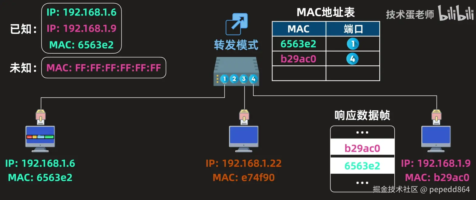 转发模式,如果是则发送响应数据帧,包含主机1的MAC地址和自身的MAC地址,交换机记录主机2的MAC地址,并查看MAC地址表发现有主机1的MAC和端口号,直接向端口号发送数据帧。